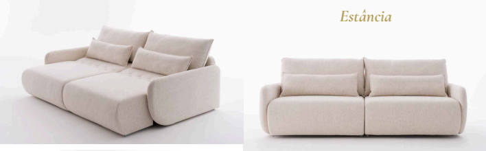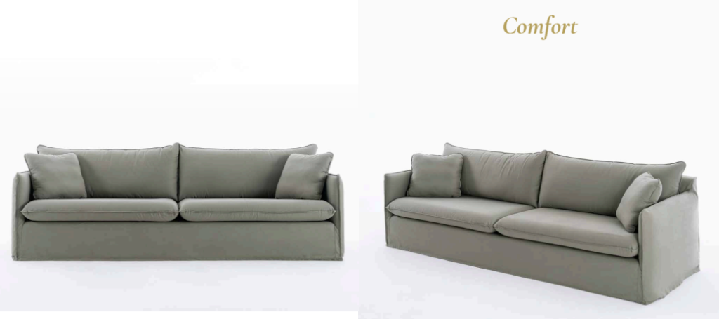 Assento fixo com espuma D 26 Soft, espuma D 33 e espuma visco elástico. Encosto fixo com espuma D 35 Hiper Soft e fibra manta e almofadas soltas com fibra siliconada.