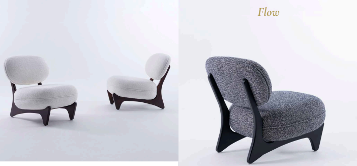 Assento fixo com molas ensacadas, espuma D26 Soft e fibra manta. Encosto fixo com espuma D 35 Hiper Soft e fibra manta, braço em aço carbono, com acabamento em lamina de cinamomo ou em couro.