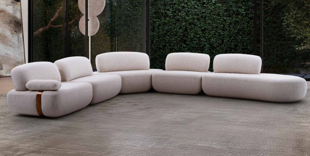 Sofá fixo com formas orgânicas. Assento com espuma D 26 Soft. Encosto com espuma D 35 Hiper Soft.